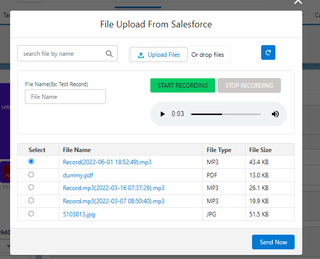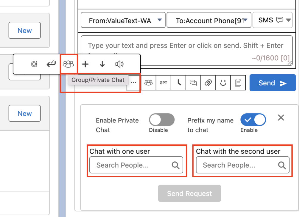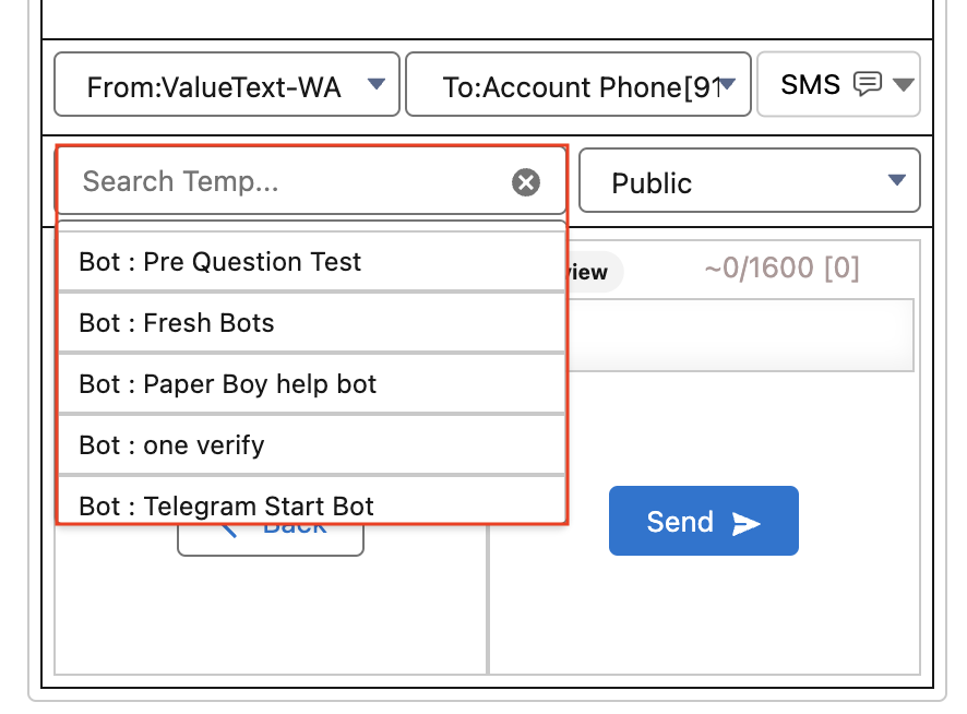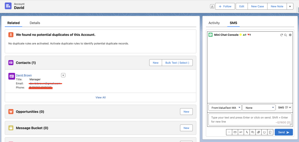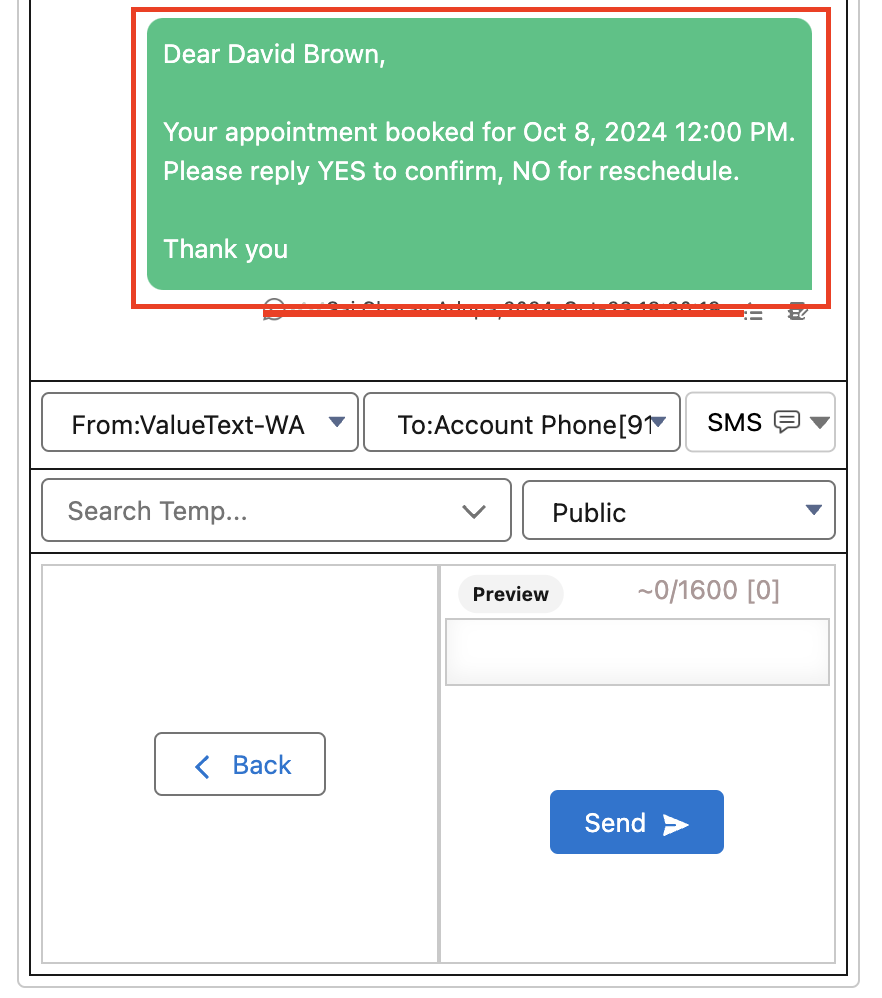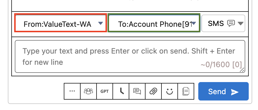 The available To numbers are automatically loaded from the phone fields on the record you opened.