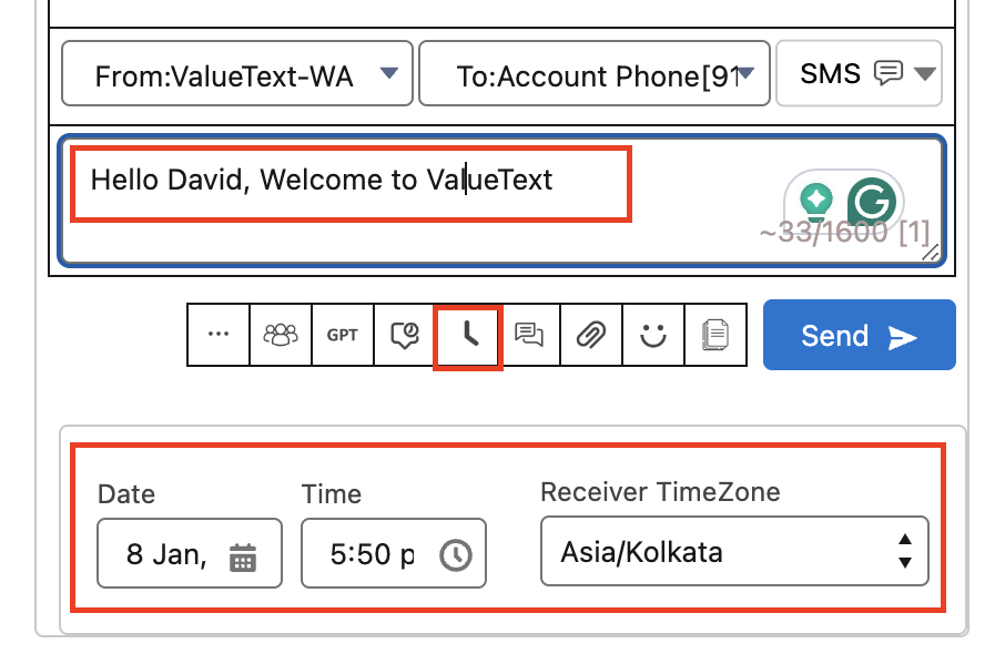 Select your preferred date and time. The message will be sent automatically at the selected time.