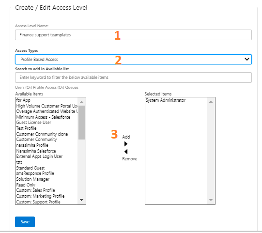 - Access Level/Template folder is used to access the templates based on Profile, User access, and Queue.