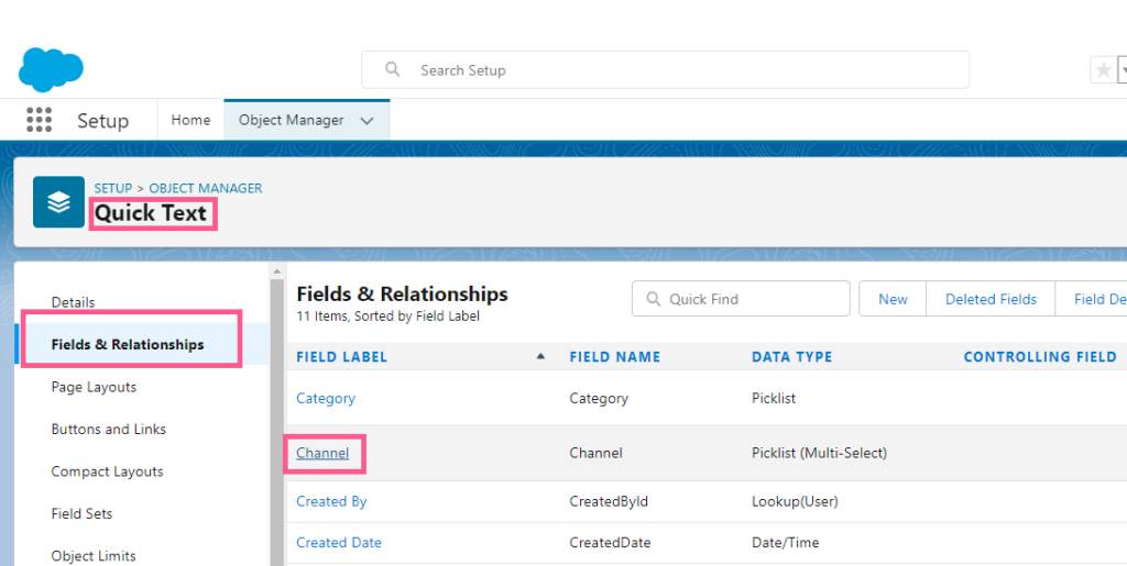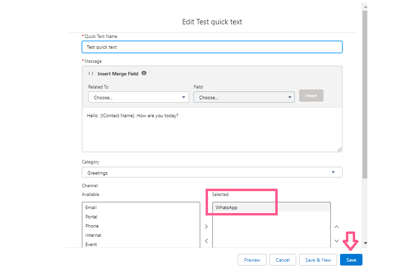 Go to >> Object Manager >>> Search for “Quick Text” >>> Click on “Fields & Relationships” >>> Click on “Channel” >>> Add the “WhatsApp” picklist value to that filed as shown on the image below >>> Click “Save”