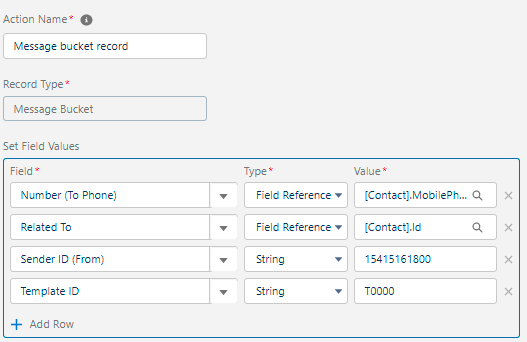 Field: “Related To” > Type: “Field Reference” > Value: [Contact].Id (This will help to create a history of SMS)