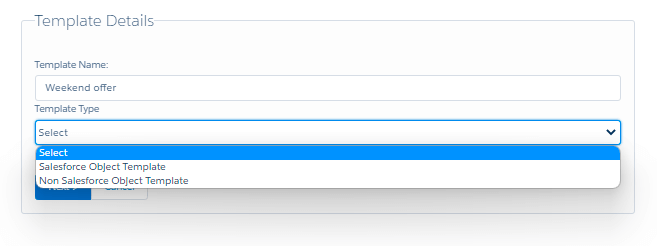 To create Salesforce object templates choose “Salesforce object template” in template type, then search object by name and select a value to create the custom template.
