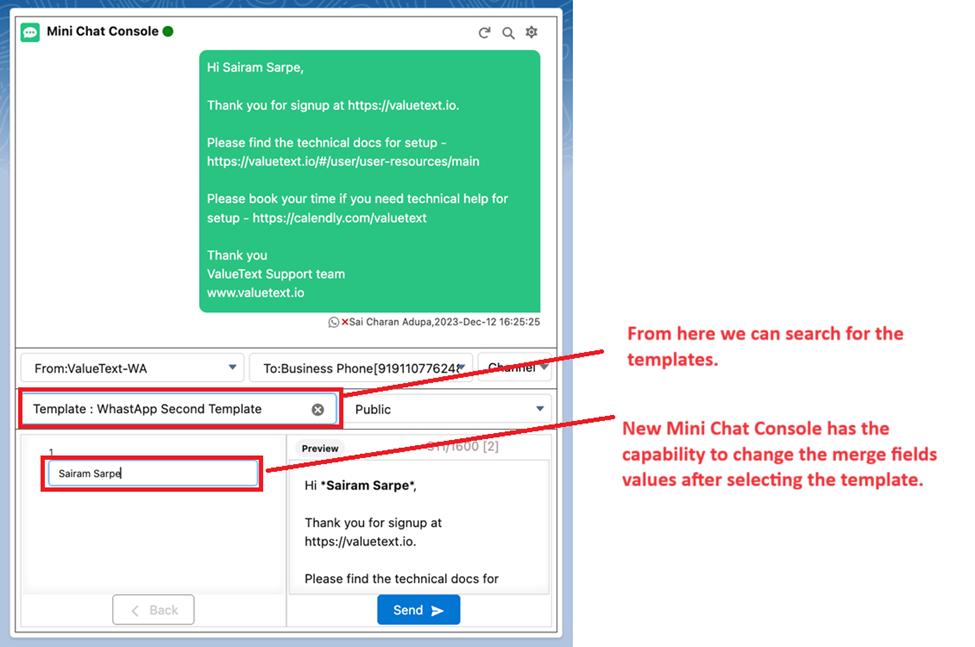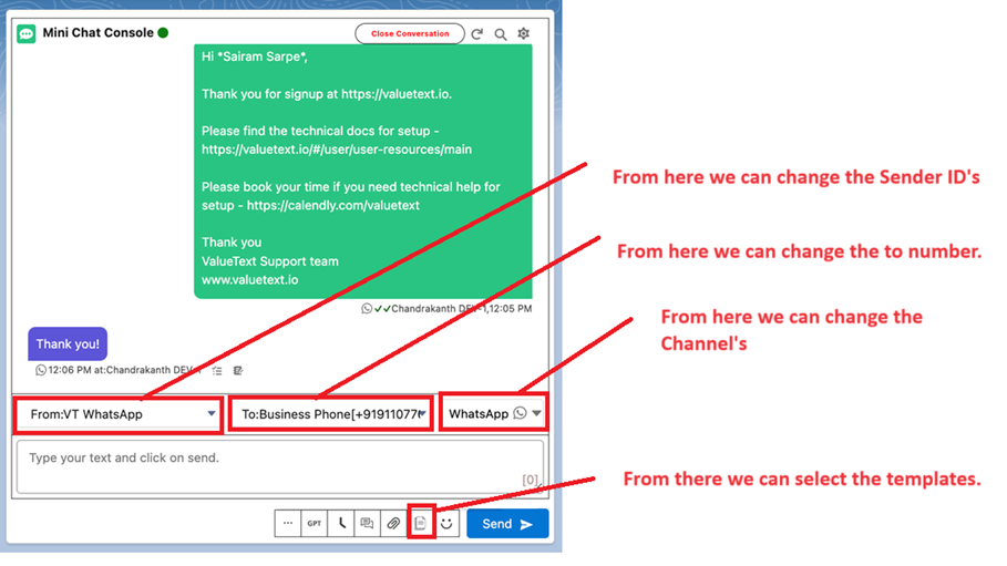 For guidance on modifying the Sender, Channels, and Numbers, please refer to the image below. Additionally, the following image provides a step-by-step explanation of how to select templates within the new MiniChat console.