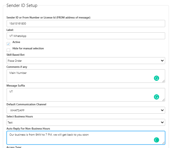 9. Provide access to the Sender ID for sending messages by selecting the “Access Type”, and we can provide access based on the profiles, users, or queues.