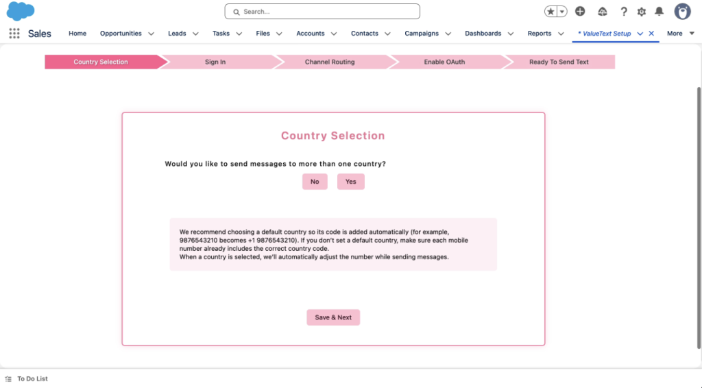 Select SMS, WhatsApp, or both. This defines your default messaging behavior inside Salesforce.
