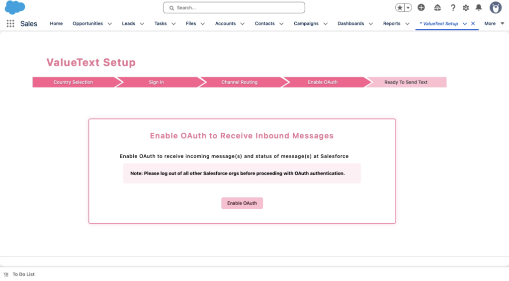 Click Enable OAuth, log in when prompted, and allow access so ValueText can receive inbound messages securely inside Salesforce.