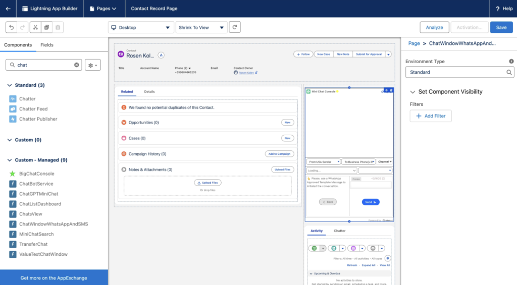 Open any record, click the gear icon, select Edit Page, search for Chat Window WhatsApp and SMS, and drag it into the layout.